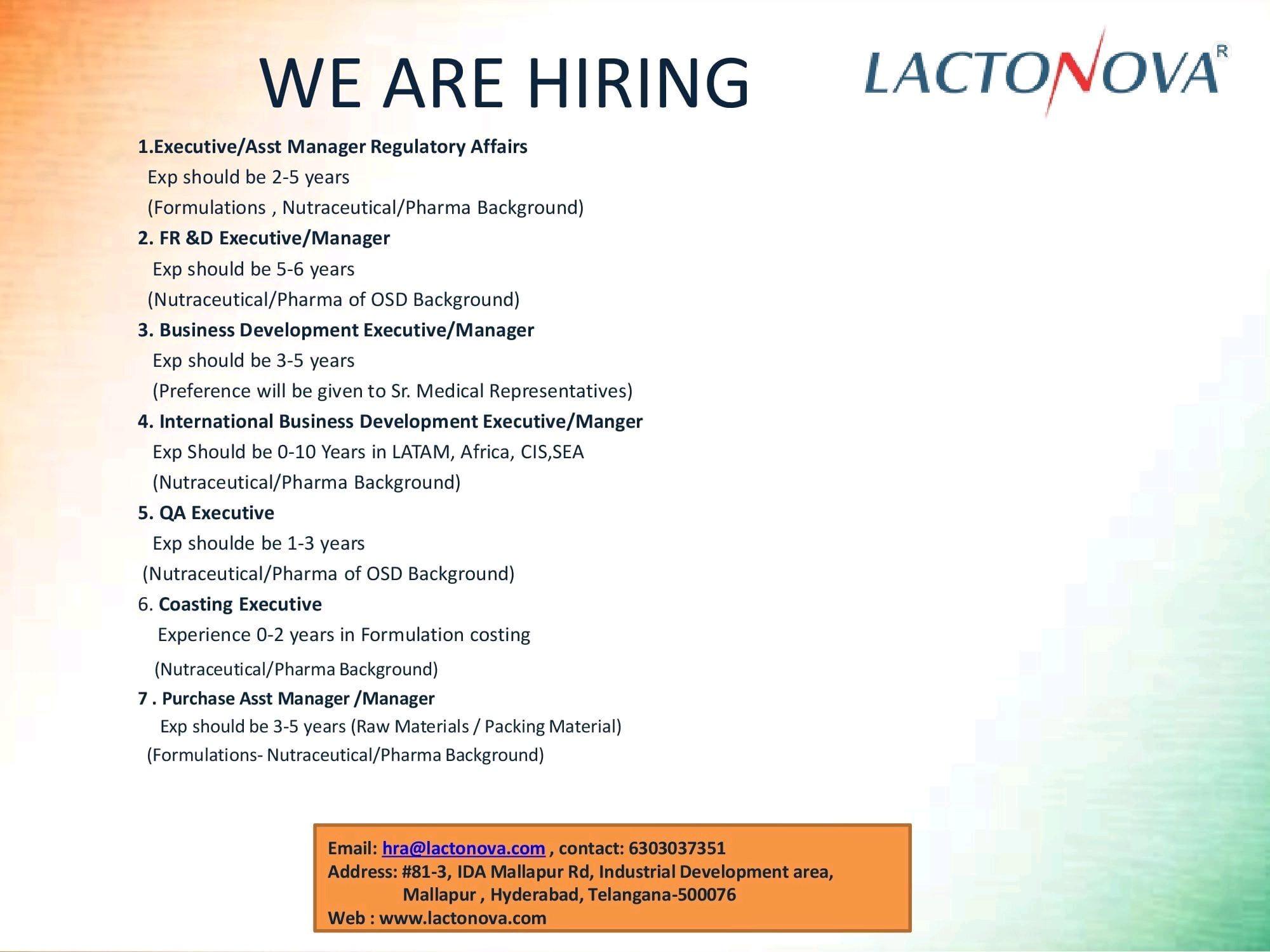 LACTONOVA hiring for Regulatory Affairs, FR &D, QA, Purchase, Coasting, Business Development