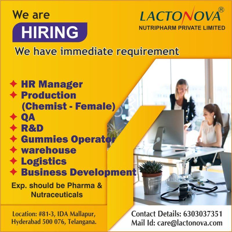 Lactonova Nutripharm hiring for HR Manager, Production, QA, R&D, Warehouse, Logistics, Business Development- Apply now