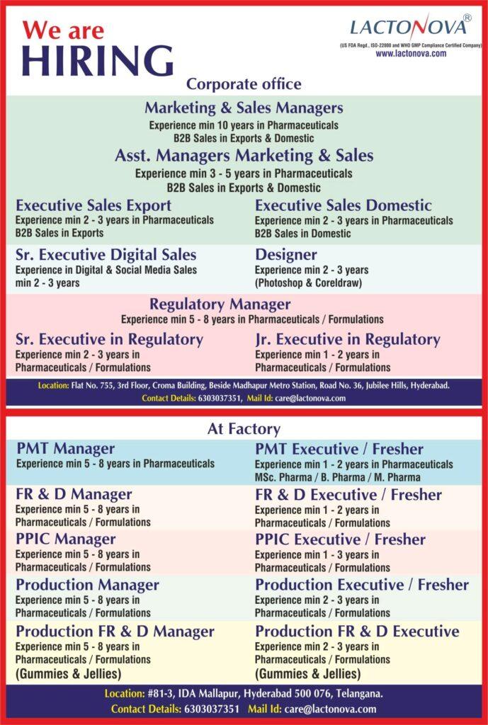 Lactonova Nutripharm immediate requirement for multiple positions in Marketing & Sales, Export, Digital Sales, Domestic, Regulatory, FR & D, PPIC & Production – Freshers & experience can apply