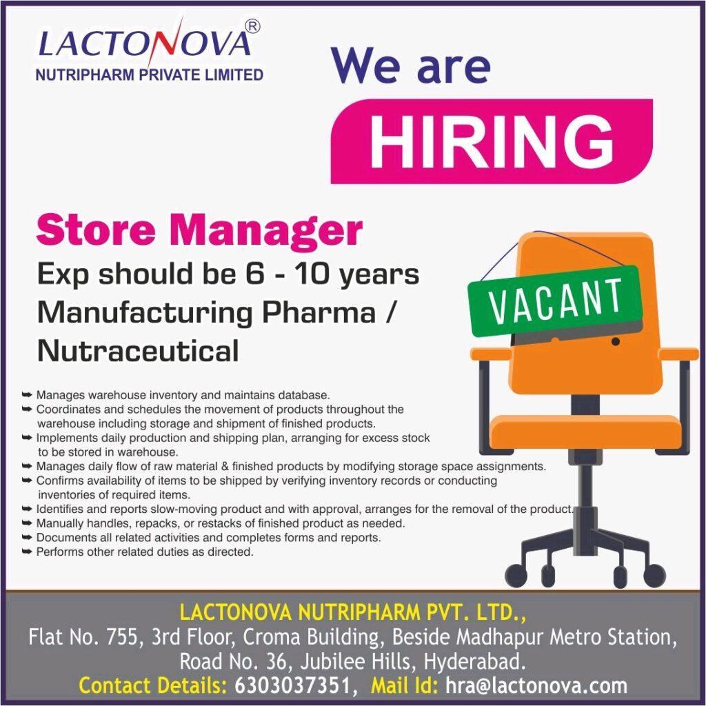 Lactonova Nutripharm Walk in Interview for Store Manager on 30-04-2022