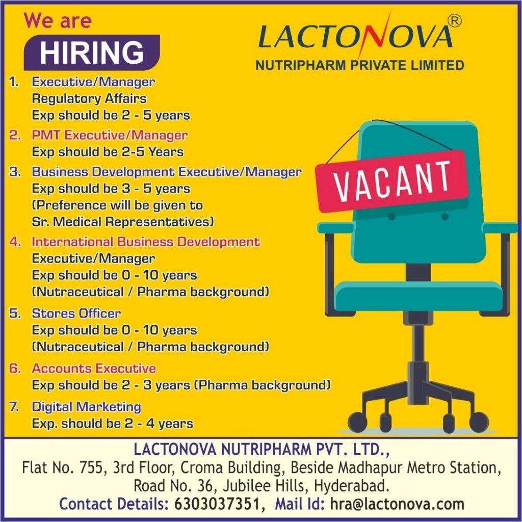 Lactonova Nutripharm Walk In Interview for Regulatory Affairs, PMT, Business Development, Stores Officer & Accounts on 18-04-2022 @Hyderabad
