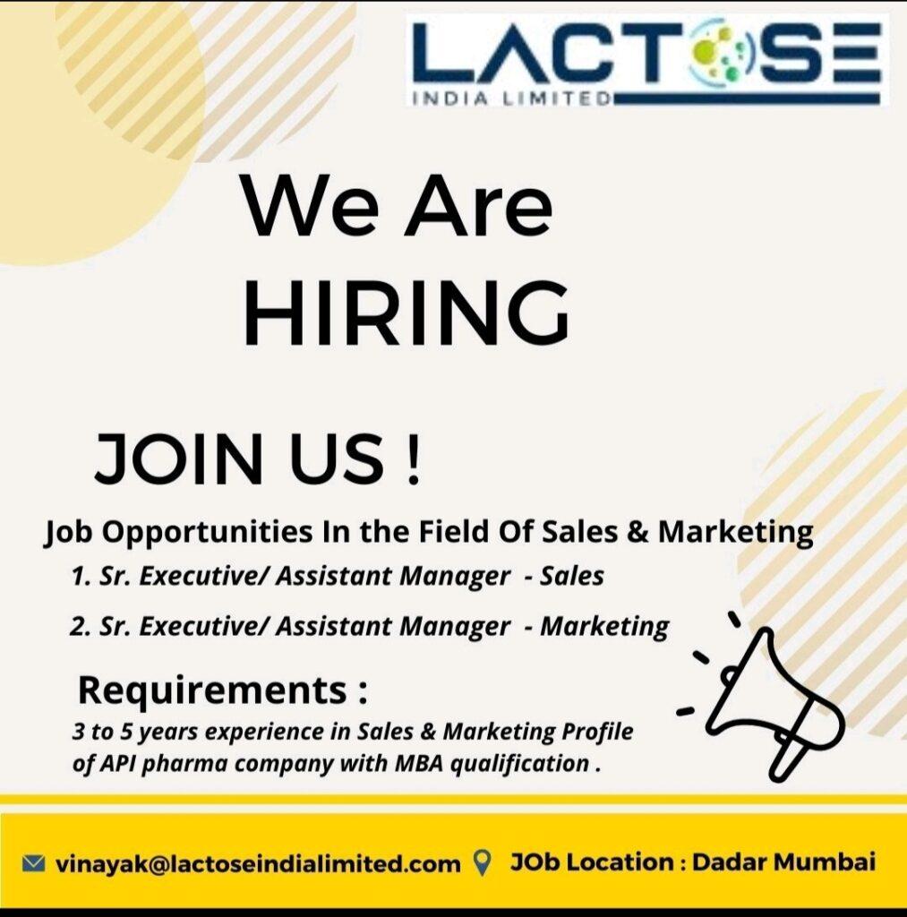 Lactose India Limited hiring for Sales & Marketing department