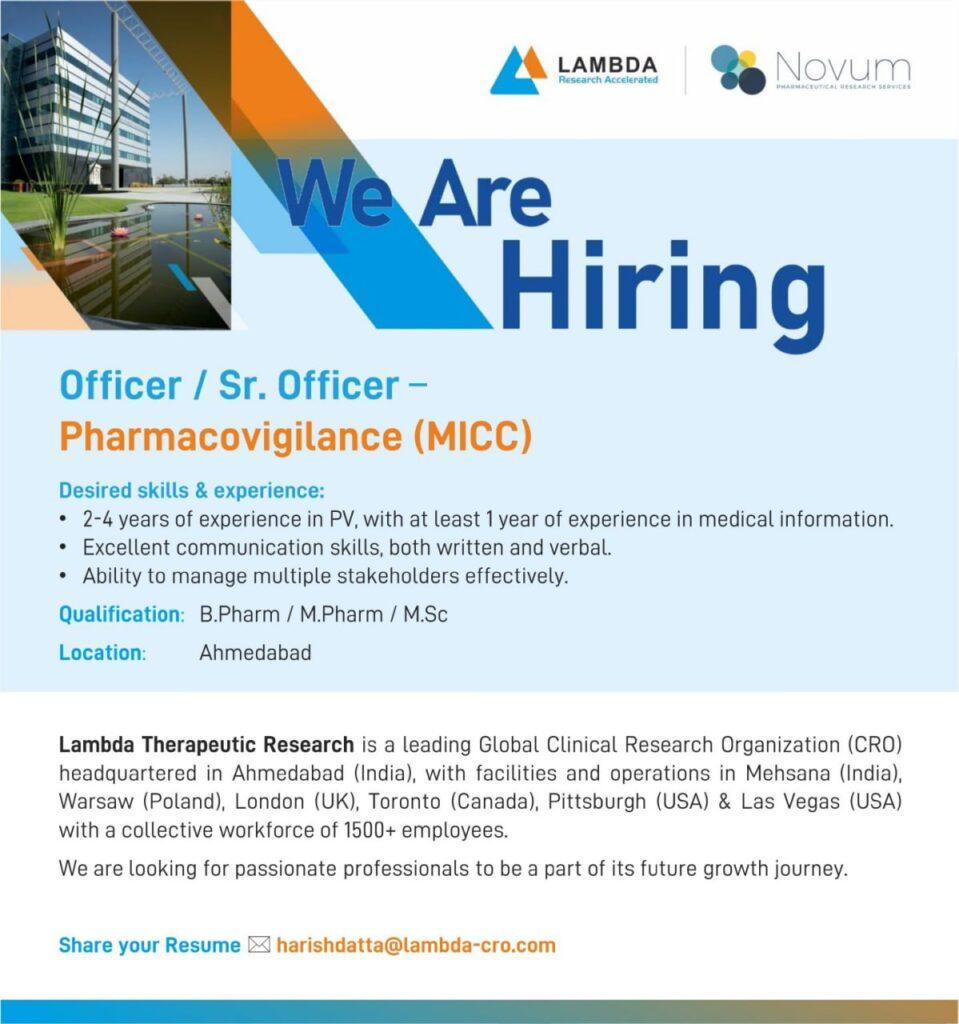 Lambda Therapeutic Research- Job vacancy for Officer/ Sr. Officer – Pharmacovigilance (MICC) Apply Now