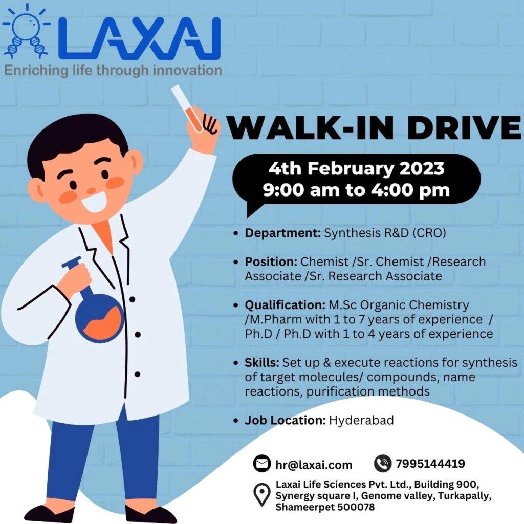 Laxai Life Sciences- Walk In Drive for Synthesis R&D (CRO) on 4th February 2023