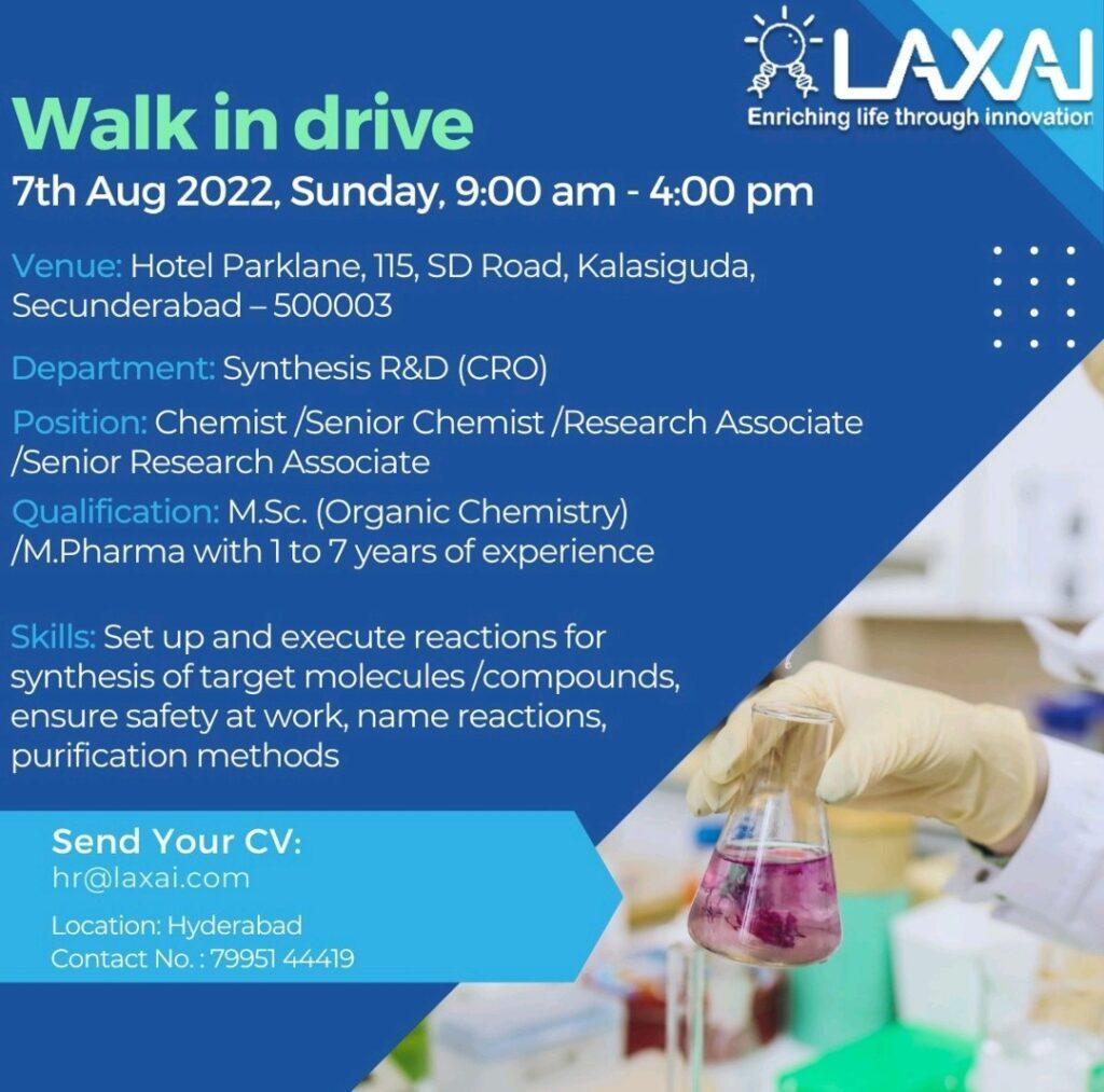 LAXAI Life Sciences Walk in drive on 7th Aug 2022, Sunday at Hotel Parklane, Secunderabad- Chemist /Senior Chemist /Research Associate /Senior Research Associate in both Synthesis R&D as well as CDMO