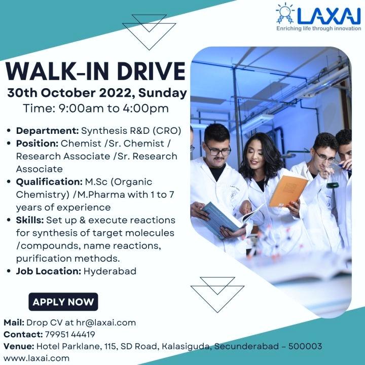 LAXAI Walk In Drive for Chemist /Sr. Chemist / Research Associate / Sr. Research Associate – Synthesis R&D (CRO) on 30th October 2022