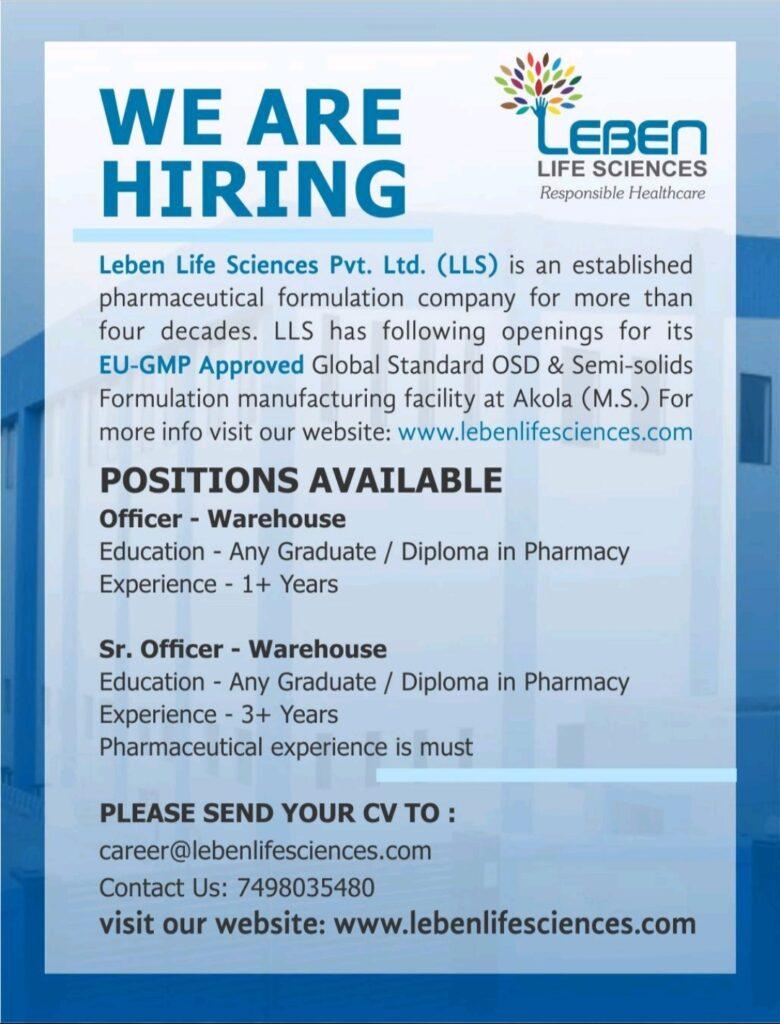 Leben Life Sciences- hiring for Officer/ Sr. Officer – Warehouse department
