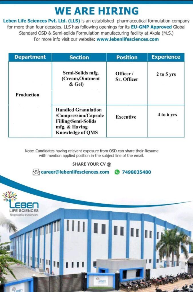 Leben Life Sciences Pvt. Ltd. (LLS) is an established pharmaceutical formulation company for more than four decades. LLS has following openings for its EU-GMP Approved Global Standard OSD & Semi-solids Formulation manufacturing facility at Akola (M.S.) For more info visit our website: www.lebenlifesciences.com
