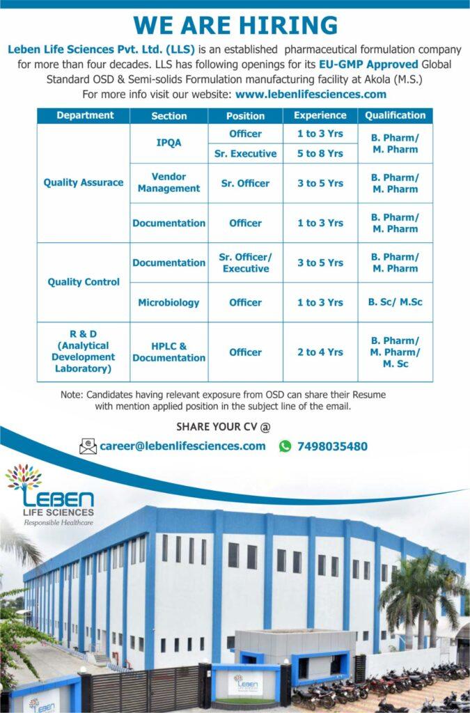 Leben Life Sciences Pvt. Ltd. (LLS) is an established pharmaceutical formulation company for more than four decades. LLS has following openings for its EU-GMP Approved Global Standard OSD & Semi-solids Formulation manufacturing facility at Akola (M.S.) For more info visit our website: www.lebenlifesciences.com