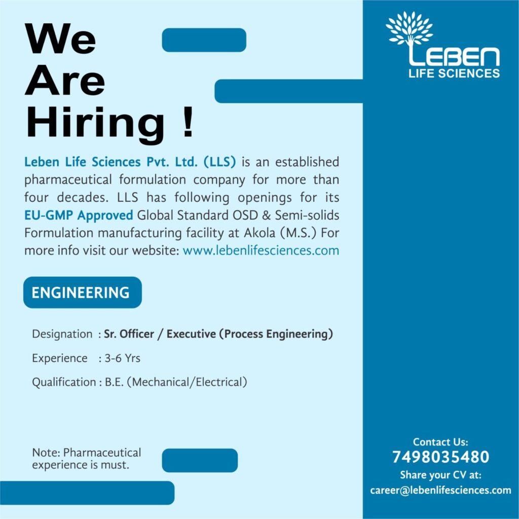 Leben Life Sciences Pvt. Ltd. (LLS) is an established pharmaceutical formulation company for more than four decades. LLS has following openings for its EU-GMP Approved Global Standard OSD & Semi-solids Formulation manufacturing facility at Akola (M.S.) For more info visit our website: www.lebenlifesciences.com