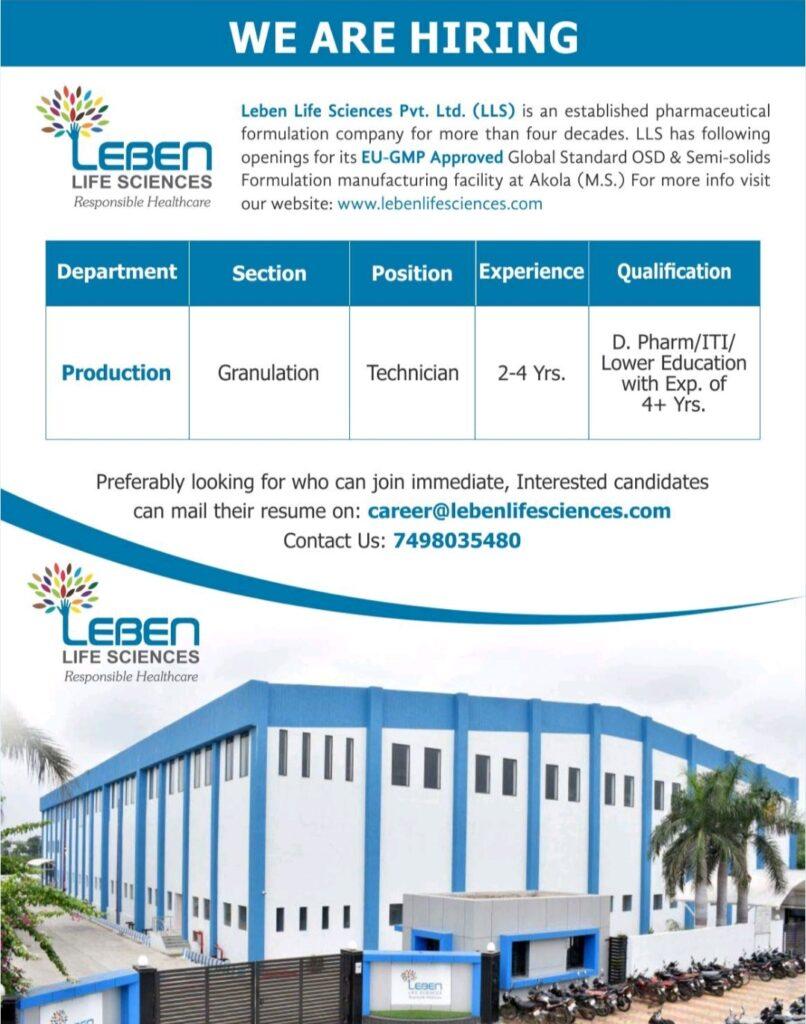 Leben Life Sciences Pvt. Ltd. (LLS) is an established pharmaceutical formulation company for more than four decades. LLS has following openings for its EU-GMP Approved Global Standard OSD & Semi-solids Formulation manufacturing facility at Akola (M.S.) For more info visit our website: www.lebenlifesciences.com