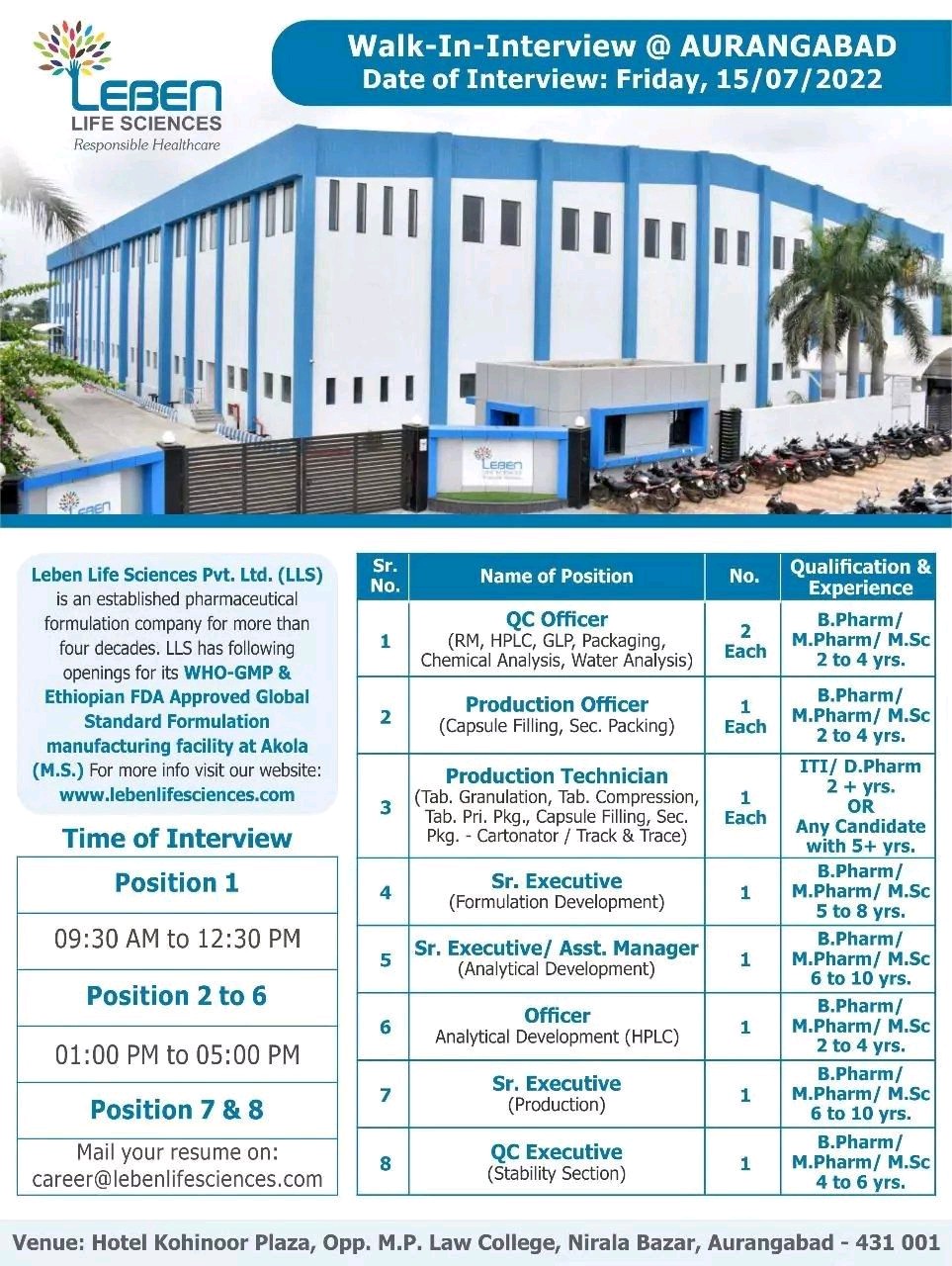 Leben Life Sciences Pvt. Ltd. Walk-In-Interview @ AURANGABAD on 15th July 2022