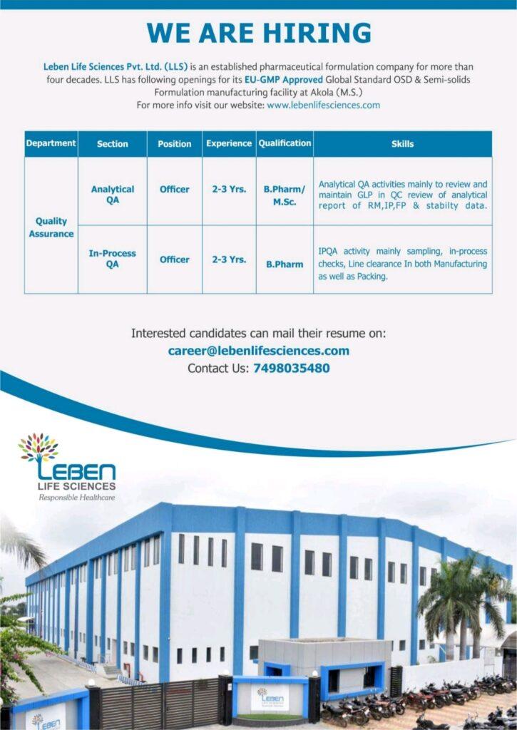 Urgent hiring for In-Process Quality Assurance Officer and Analytical Quality Assurance Officer in Quality Assurance Department at Leben Life Sciences Pvt. Ltd. Akola. Qualification/Experience: As Per Job Post