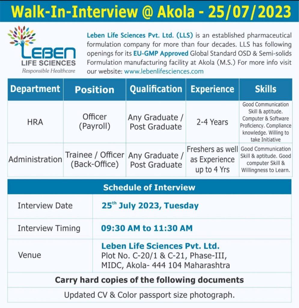 Leben Life Sciences- Walk-In-Interview for HRA, Administration on 25/07/2023