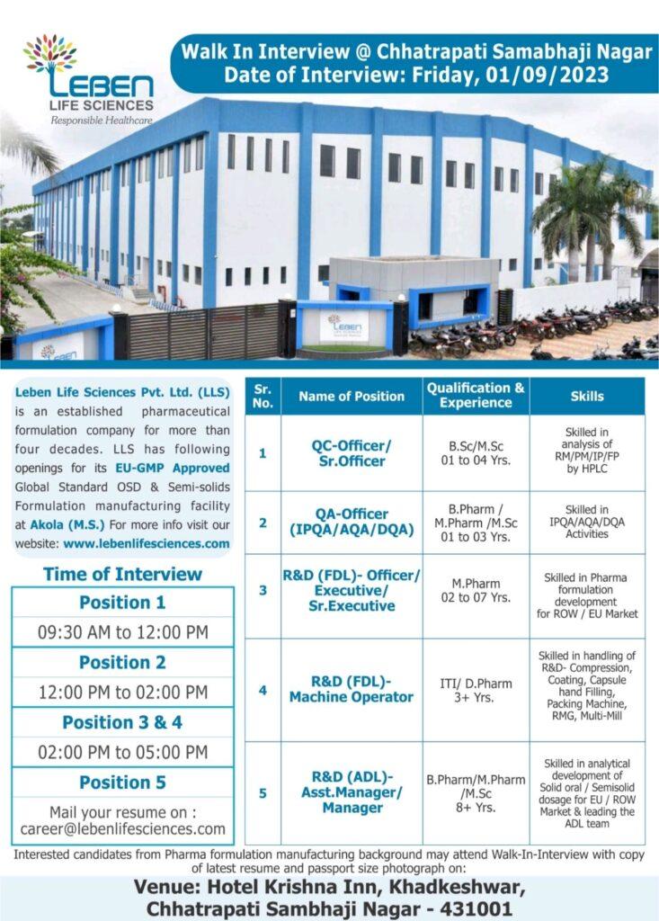 Leben Life Sciences- Walk In Interview for QA, QC, R&D on 01/09/2023