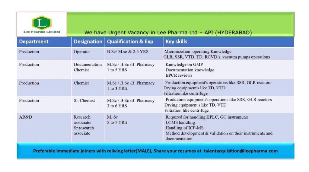 We have Urgent Vacancy in Lee Pharma Ltd – API (HYDERABAD)