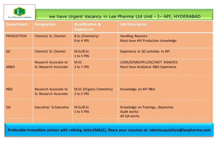 We have Urgent Vacancy in Lee Pharma Ltd Unit – I- API, HYDERABAD
