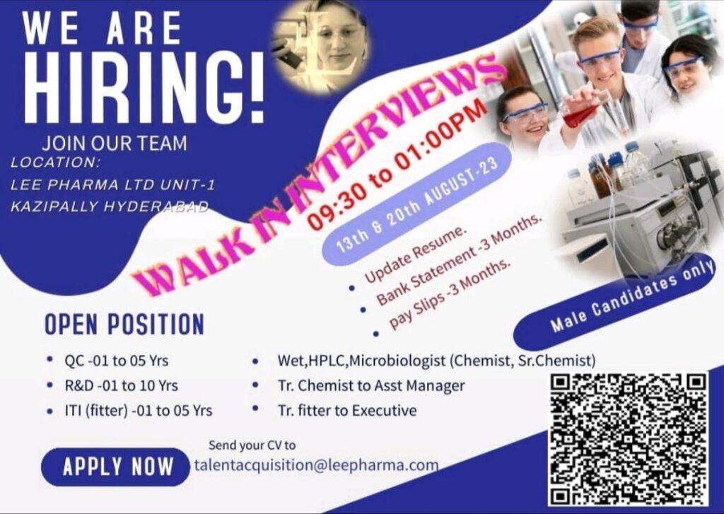 Lee Pharma- Walk In Drive on 13th & 20th August 2023 | QC, R&D, ITI (fitter)