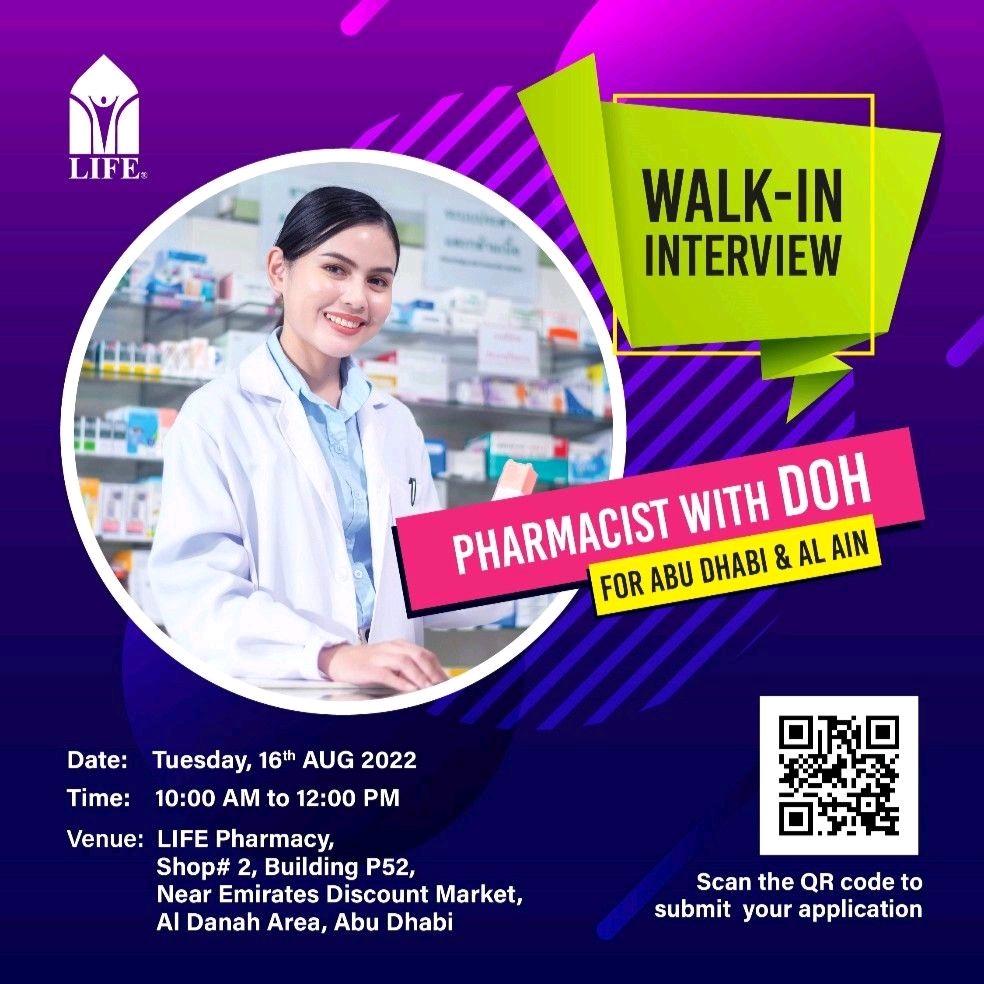 Life Pharmacy walk in interview for Pharmacist with DOH on 16th Aug 2022 @Al Ain & Abu dhabi