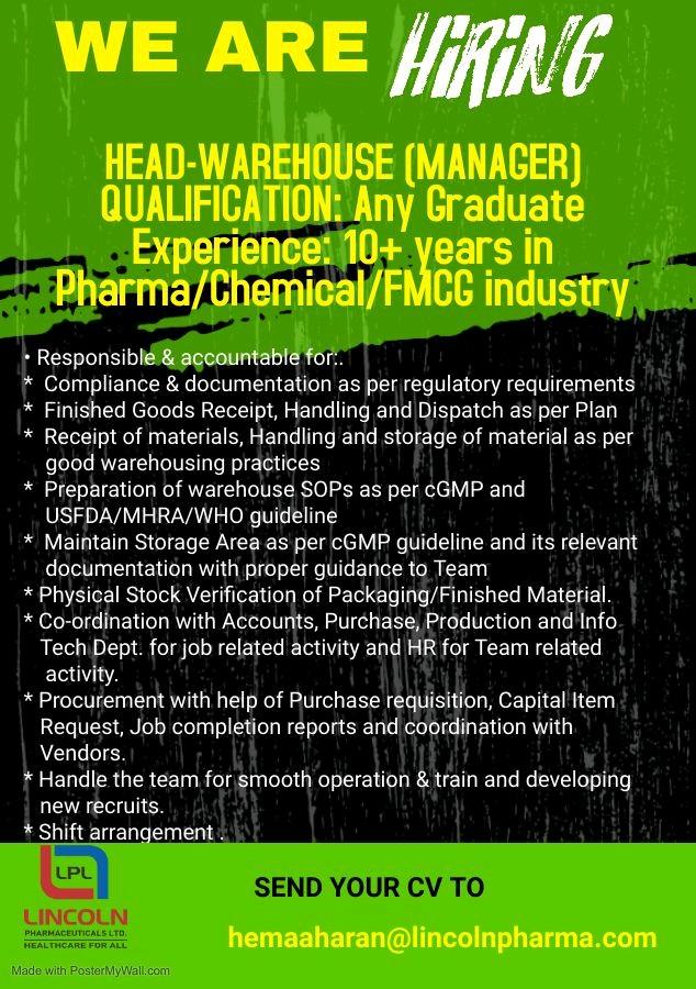 LINCOLN Pharma hiring for Head- Warehouse (Manager) department
