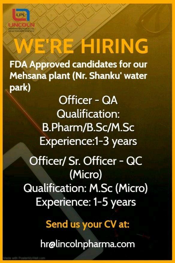 LINCOLN PHARMA Hiring for Officer/ Sr. Officer – QC (Micro) & QA department