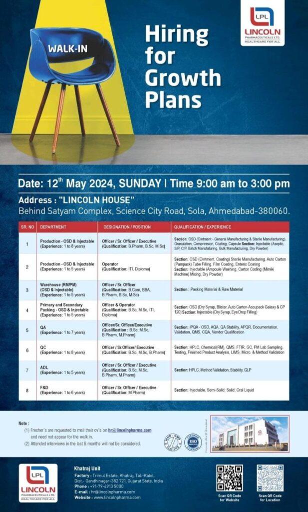 LINCOLN PHARMA Walk in interview for QA, QC, ADL, F&D, Warehouse, Production, Packing on 12th May 2024