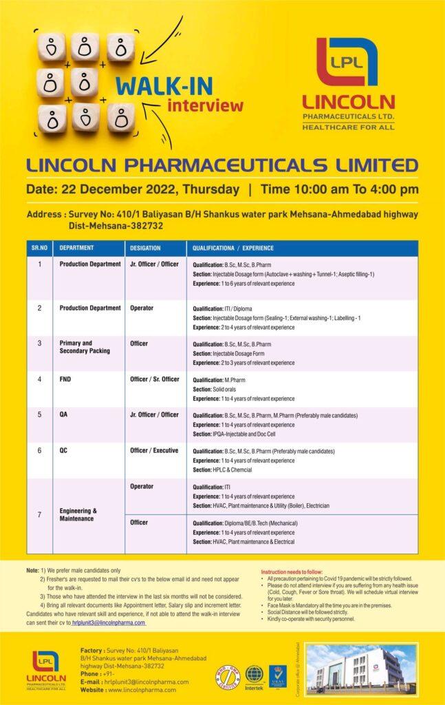 LINCOLN PHARMA- Walk In Interview for QA, QC, FND, Production, Primary and Secondary Packing, Engineering & Maintenance on 22nd December 2022