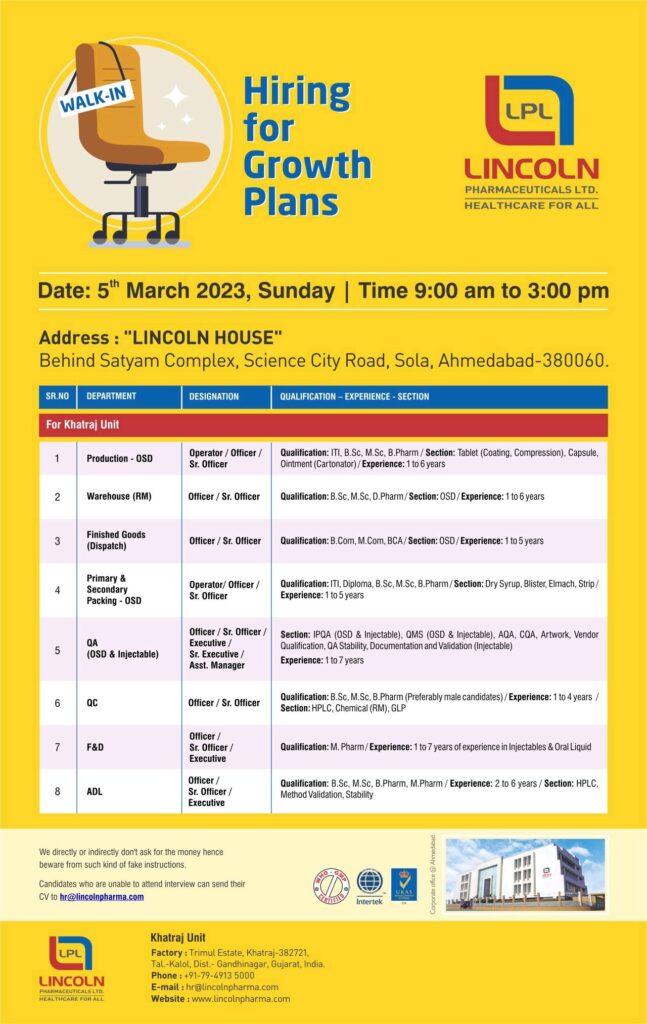 LINCOLN PHARMA- Walk In Interview for Production, Warehouse (RM), QA, QC, Finished Goods (Dispatch), F&D, ADL, Primary & Secondary Packing on 5th March 2023