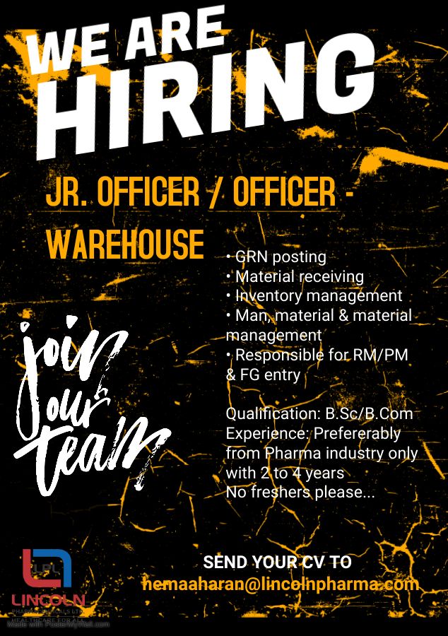 Lincoln Pharmaceuticals Limited hiring for Jr. Officer, Officer- Warehouse department