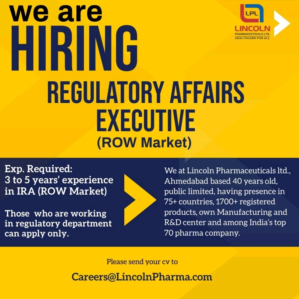 Hiring Regulatory Affairs – Executive at Lincoln pharmaceuticals ltd, Ahmedabad!!! (ROW Market)