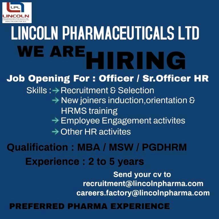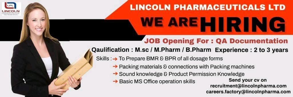 LINCOLN PHARMACEUTICALS LTD : JOB Opening For QA Documentation & Officer / Sr.Officer HR department