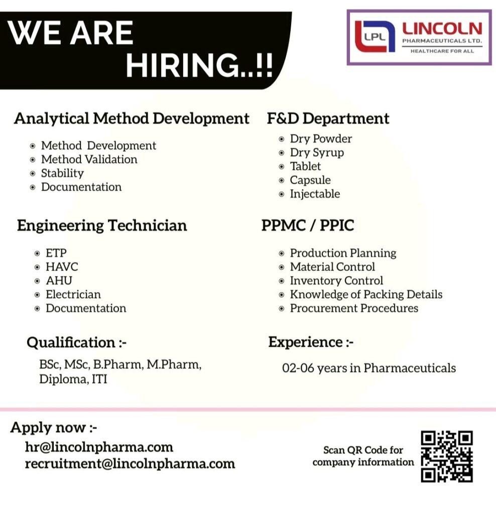 Lincoln Pharmaceuticals Ltd job vacancy for QA, QC, Warehouse, Production, F&D, PPMC/ PPIC, Engineering & Analytical Method Development department