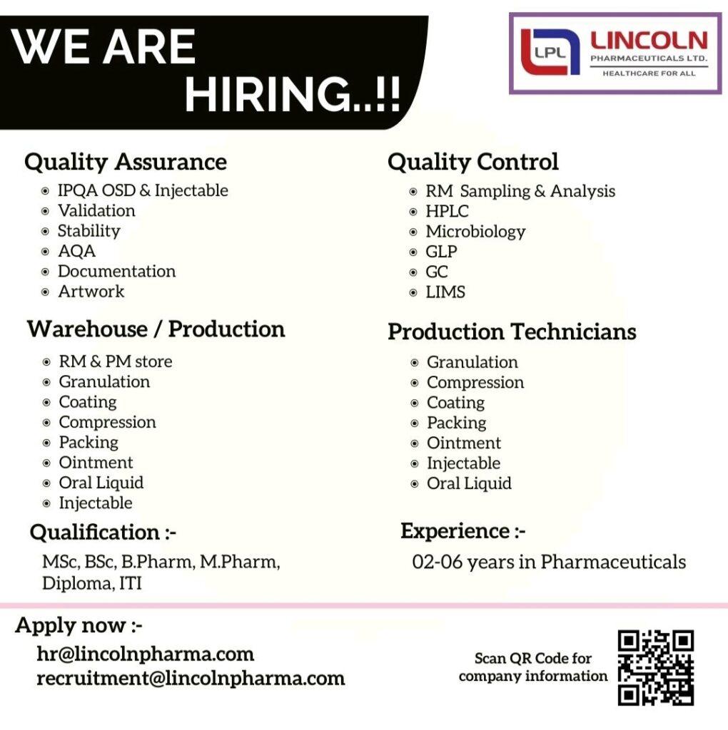 Apply now :- hr@lincolnpharma.com recruitment@lincolnpharma.com