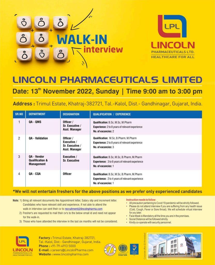 Lincoln pharmaceuticals ltd Walk-in interview for QA-QMS, QA-Validation, QA Vendor, Qualification & Management, QA-COA on 13th November 2022, Sunday