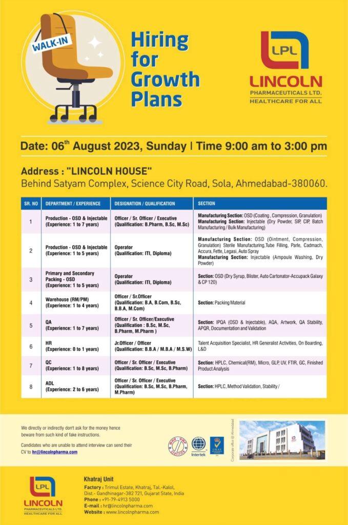 LINCOLN PHARMACEUTICALS- Walk In Interview for QA, QC, ADL, HR, Production & Packing department on 06th August 2023, Sunday