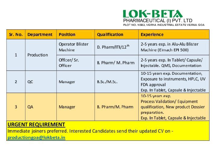 Immediate joiners preferred. Interested Candidates send their updated CV on -productiongoa@lokbeta.in