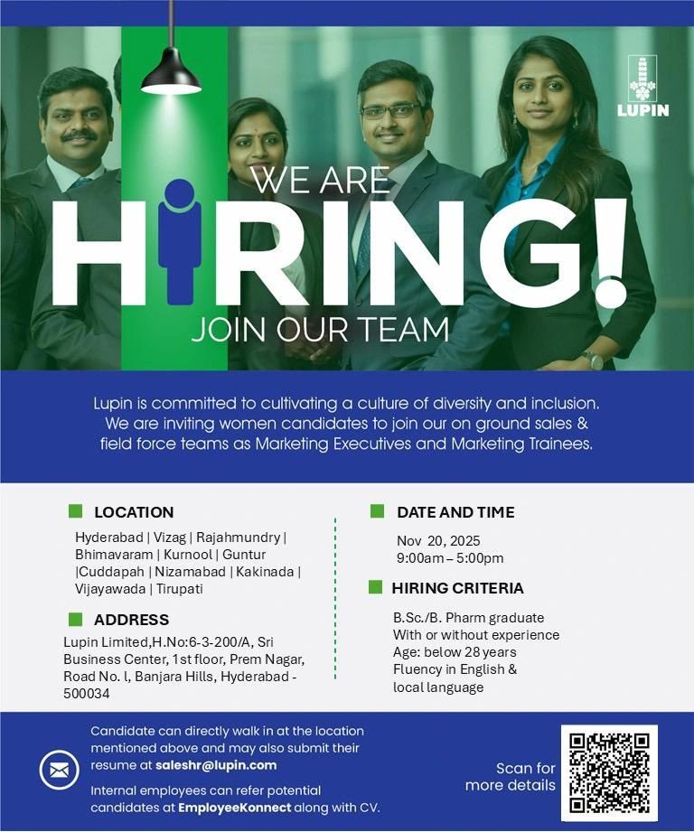 Lupin Limited, one of India’s leading pharmaceutical companies, has announced a special walk-in recruitment drive exclusively for women candidates. With a strong commitment to diversity, inclusion, and equal opportunities, Lupin is inviting talented women to join their ground sales and field force teams as Marketing Executives and Marketing Trainees.