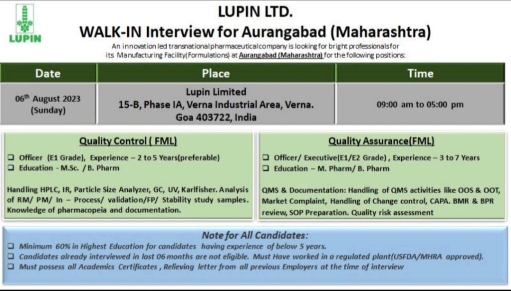 Lupin Limited– Walk In Interview for Aurangabad (Maharashtra) on 06th August 2023 (Sunday)