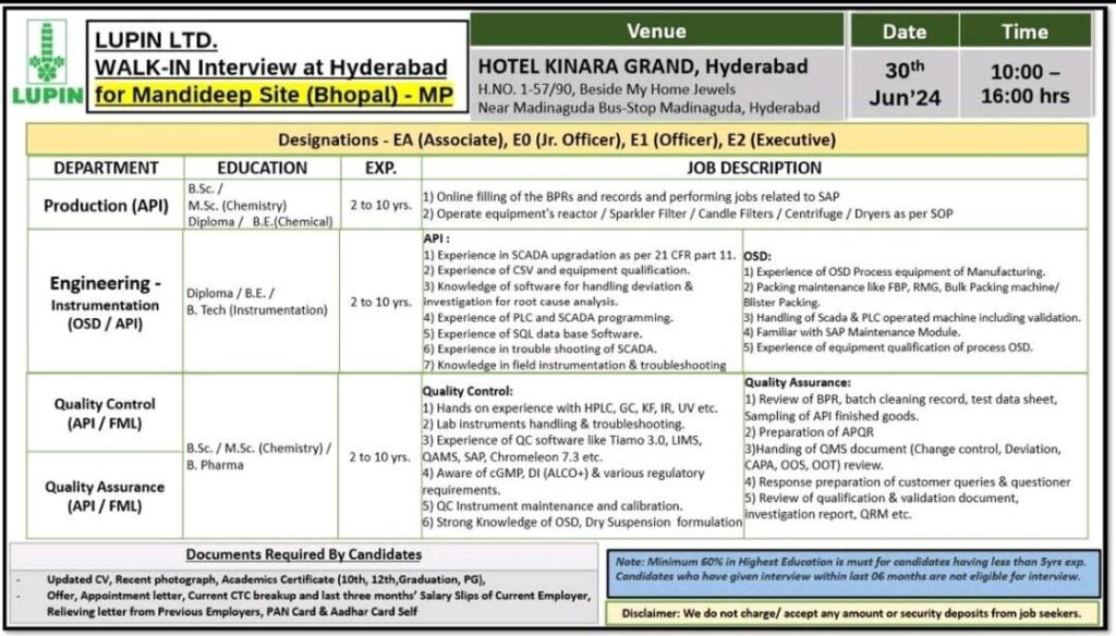 PHARMA JOBS POST > API > LUPIN LTD. WALK-IN Interview at Hyderabad for Mandideep Site (Bhopal) on 30th June 2024