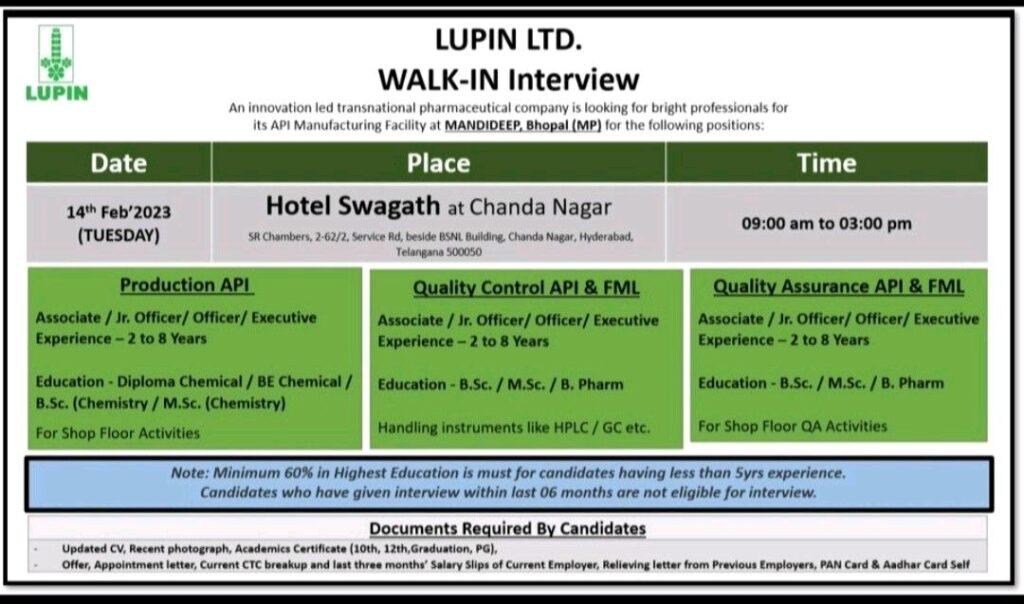 LUPIN LTD. WALK-IN Interview for Production, QA & QC on 14th Feb’2023