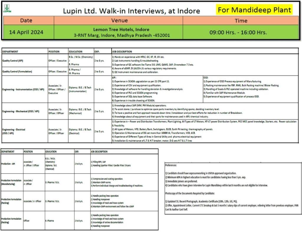 Lupin Ltd. Walk-in Interviews, at Indore on 14th April 2024