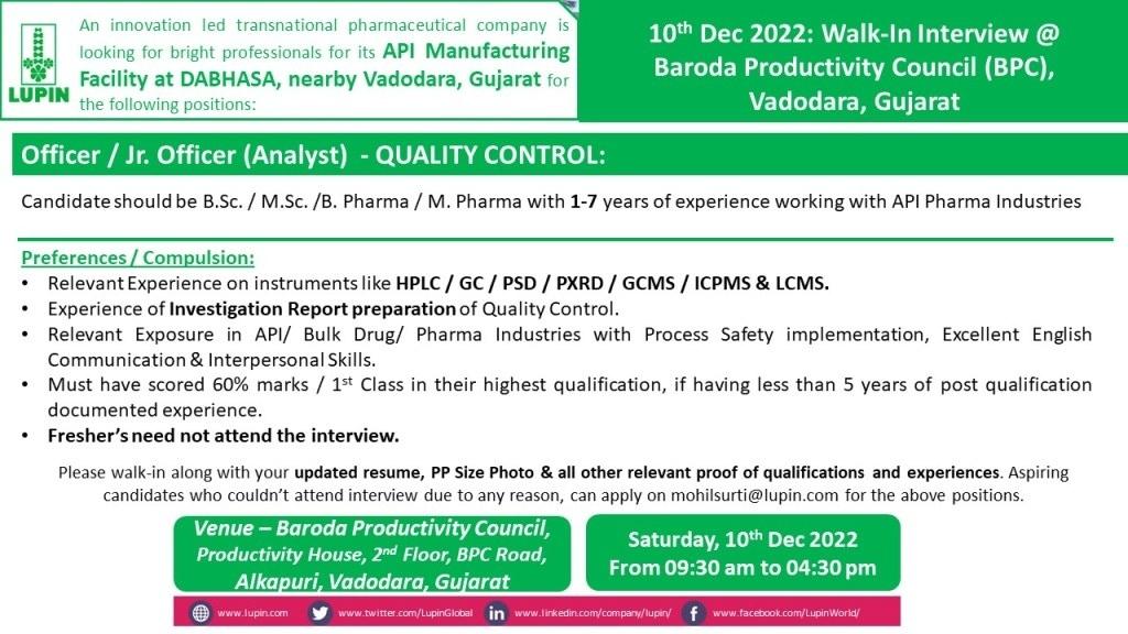 LUPIN Walk In Interview for Officer / Jr. Officer (Analyst) – Quality Control on 10th Dec 2022