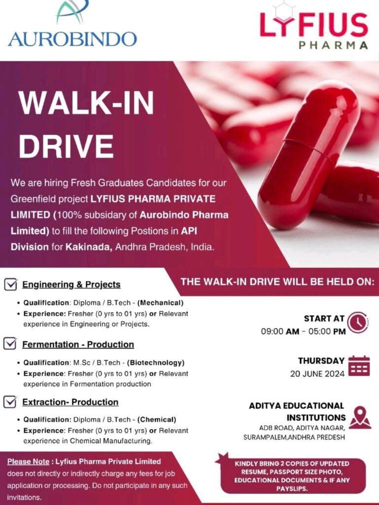 We are hiring Fresh Graduates Candidates for our Greenfield project LYFIUS PHARMA PRIVATE LIMITED (100% subsidary of Aurobindo Pharma Limited) to fill the following Postions in API Division for Kakinada, Andhra Pradesh, India.