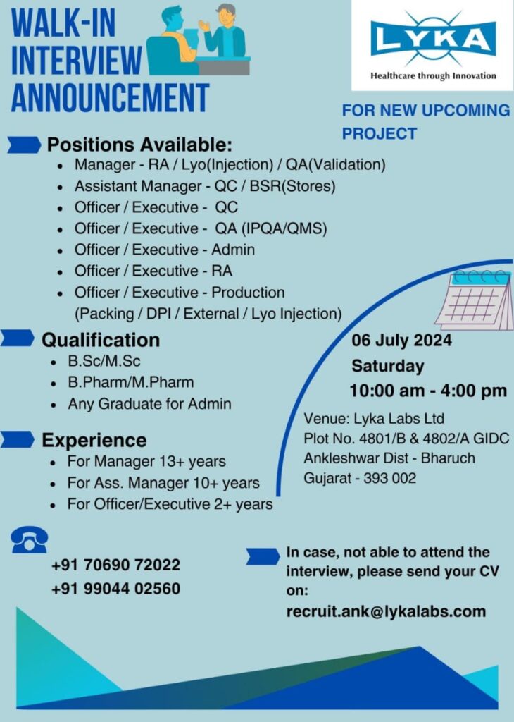 Lyka Labs Ltd hiring Officer to Manager in RA, QA, QC, Admin, Production & BSR(Stores) for new upcoming project