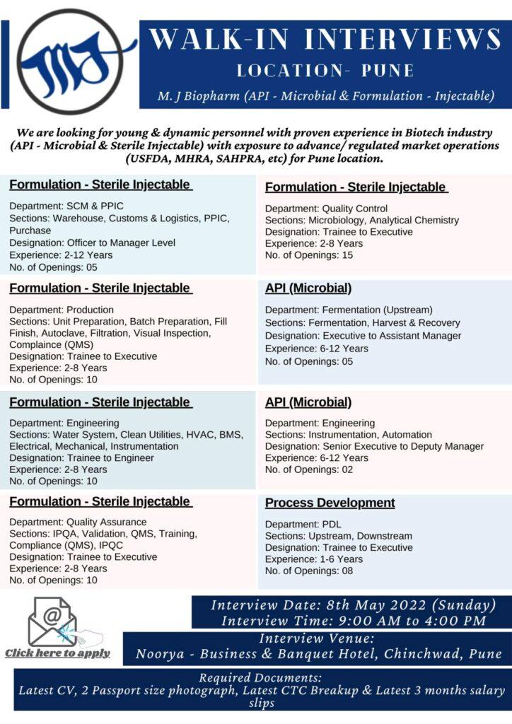 M.J. Biopharm Private Limited WALK-IN INTERVIEWS on 8th May 2022 (Sunday) @Chinchwad, Pune