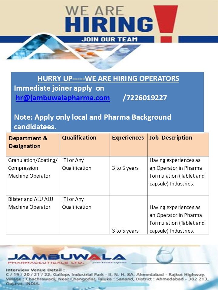 Jambuwala Pharmaceuticals hiring Granulation/ Coating/ Compression Machine Operator/ Blister and ALU ALU Machine Operator