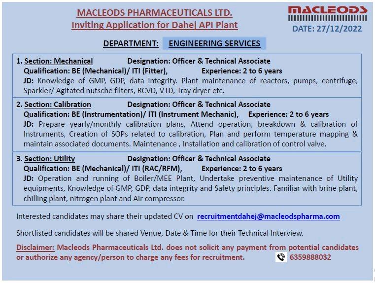 Interested candidates may share their updated CV on recruitmentdahej@macleodspharma.com