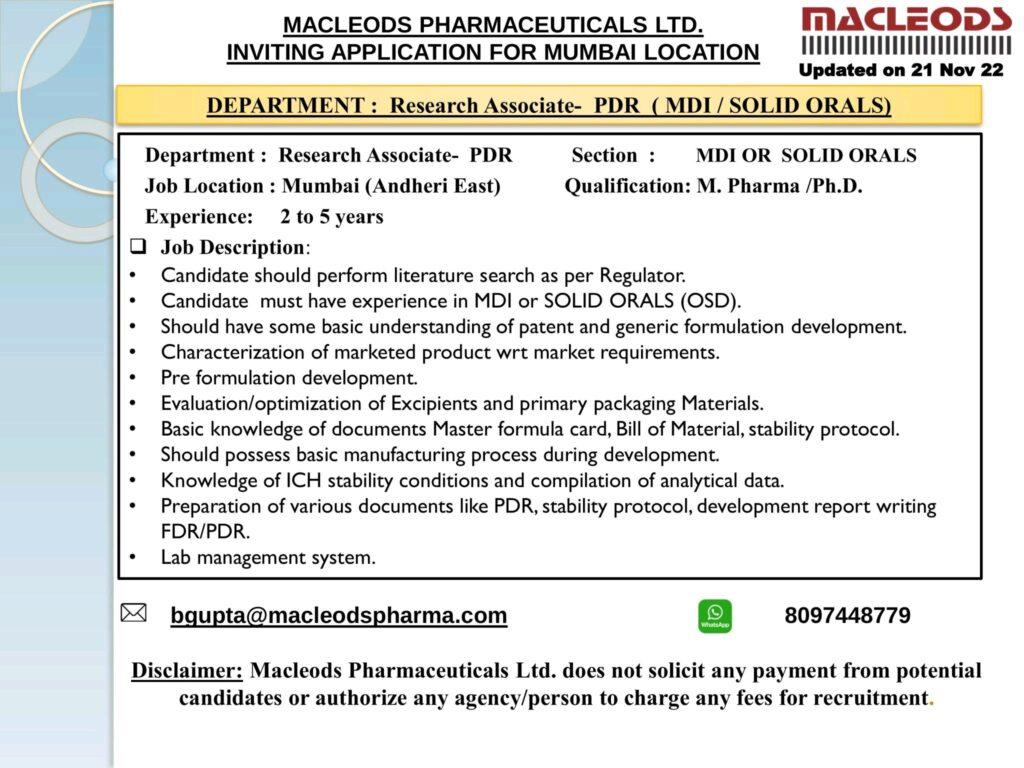 MACLEODS PHARMACEUTICALS LTD. is inviting applicants for the *Research Associate – ( MDI / SOLID ORALS)* at *Mumbai Location*