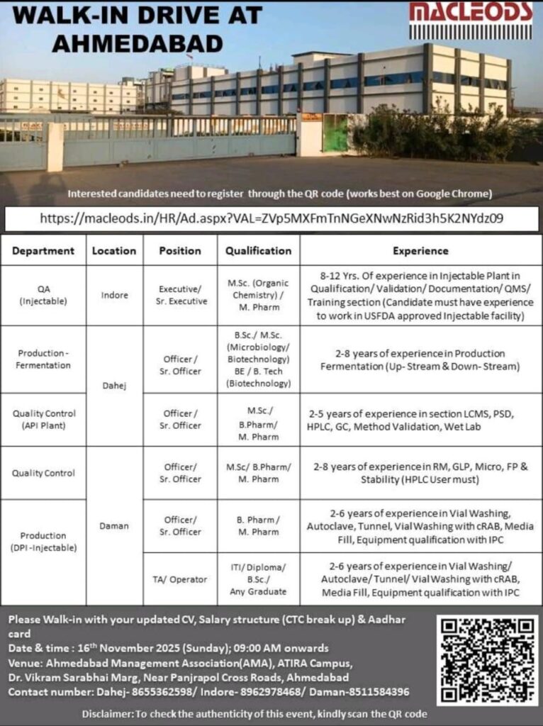 Macleods Pharmaceuticals Ltd, one of India’s fastest-growing pharmaceutical companies, is conducting a Walk-In Drive at Ahmedabad for multiple positions in QA, QC, Production, and Fermentation departments. Candidates with experience in injectable, API, or fermentation manufacturing are invited to attend.