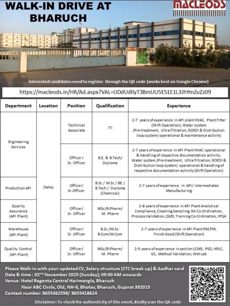 Macleods Pharmaceuticals Ltd., one of India’s fastest-growing pharmaceutical companies, is conducting a Walk-In Drive for various technical and quality departments at its API plant in Dahej, Bharuch (Gujarat). This is an excellent opportunity for skilled professionals in the API manufacturing sector to join a reputed organization known for its global presence and high-quality pharmaceutical products.